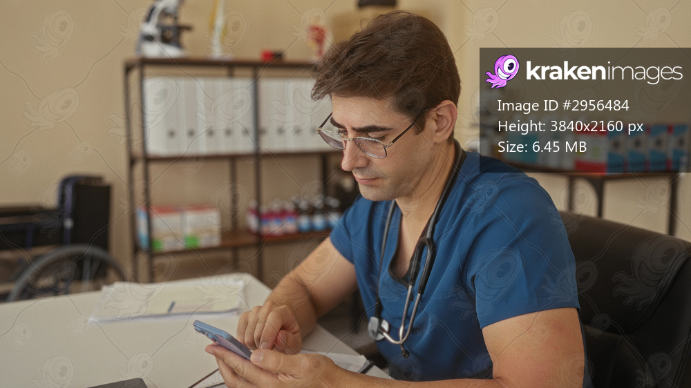 Man doctor in scrubs checks smartphone and reviews paperwork with hand at desk in clinic building; quiet concentration.