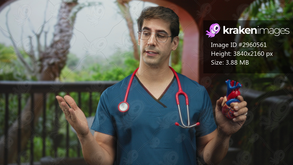 Man doctor in scrubs holds anatomical heart model in right hand and gestures with left palm up on a building balcony; medical education instructional.