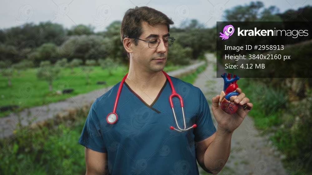Man doctor in scrubs holds anatomical heart model in right hand, stethoscope on neck, standing on forest path; medical education serious.