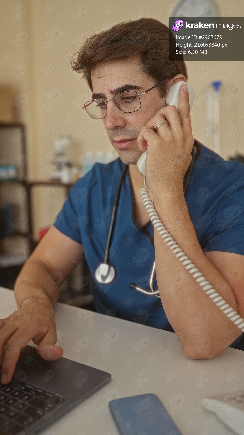 Man doctor in scrubs holds phone handset to ear while typing on laptop in a medical building; focused care.