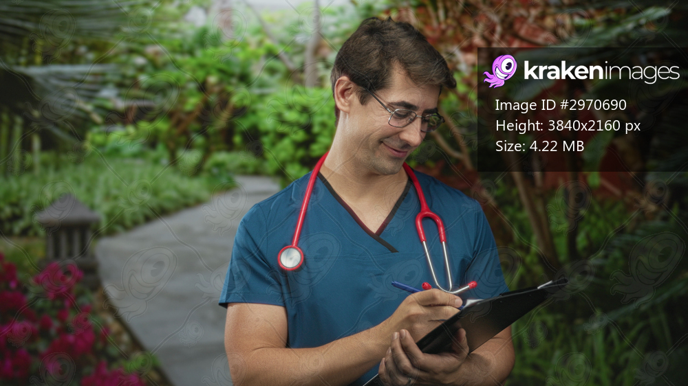Man doctor in scrubs offers pen and clipboard on street walkway framed by garden plants and path; compassion.