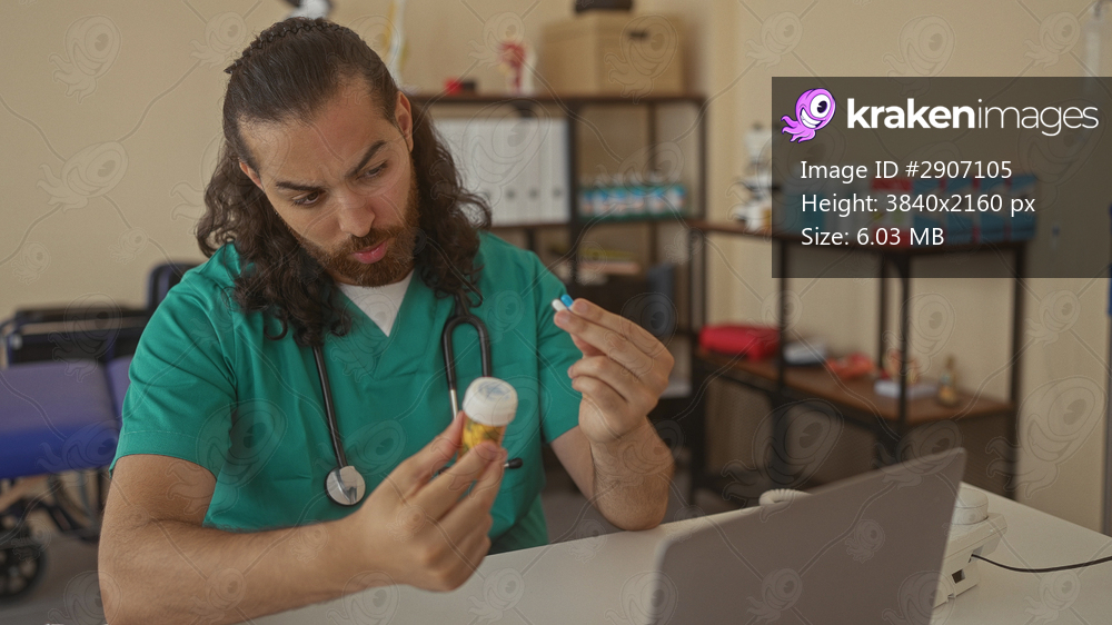 Man doctor in scrubs with stethoscope examining pill bottle and pill with hands in clinic building; medication safety concern.