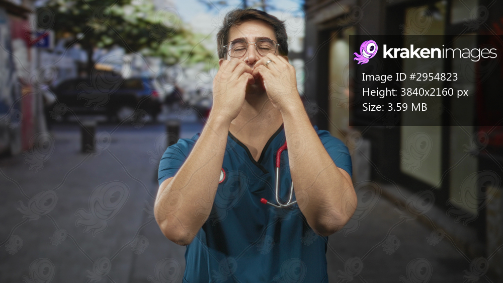 Man doctor in scrubs with stethoscope and glasses rubs nose with hands while smiling and raising arms on street; relief gratitude hope.