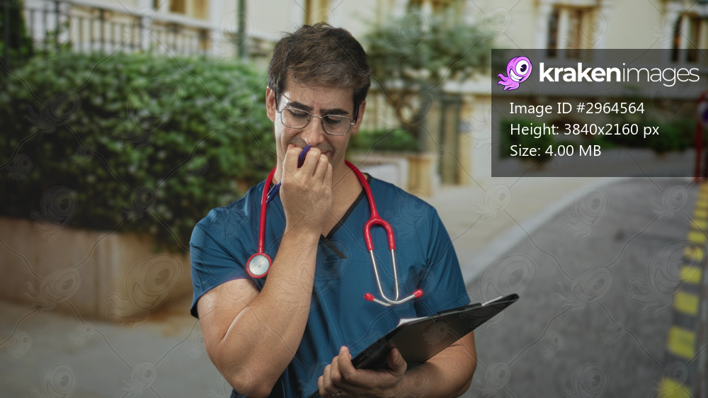 Man doctor in scrubs with stethoscope writes on clipboard on street; concentration thinking focus analysis.