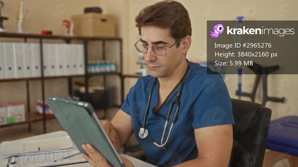 Man doctor in scrubs taps tablet with hand, stethoscope visible at clinic building; professional care focused.
