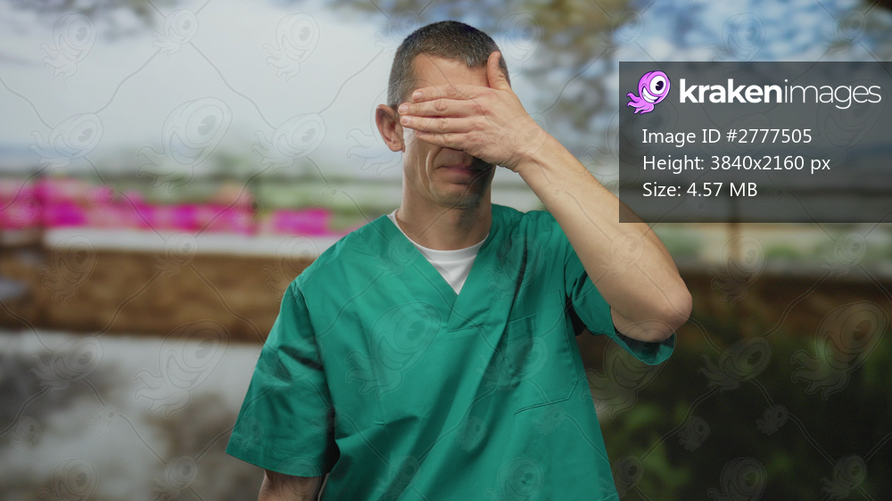 Man doctor in uniform covering eyes outdoors with green uniform and background, expressing tension in a serene park setting, highlighting medical and emotional themes. - Kraken Images