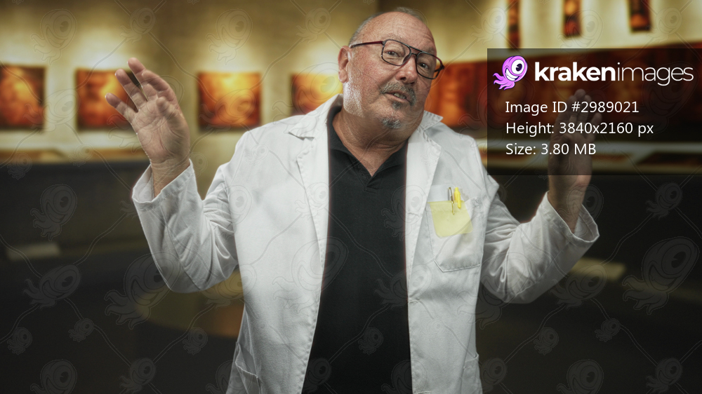 Man doctor in white coat clasping hands and gesturing, pens in pocket, standing before framed art in a gallery building; thoughtful reflection.