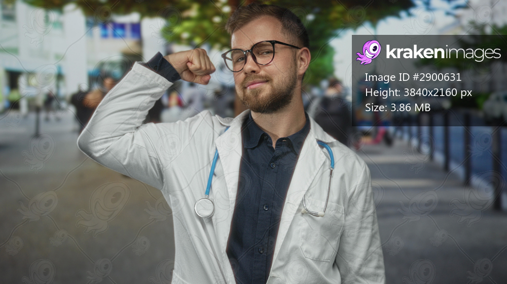 Man doctor in white coat flexes arm to show bicep with stethoscope on busy city street; confidence strength dedication.