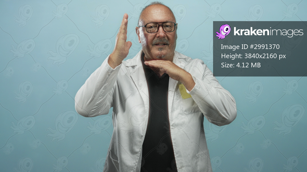 Man doctor in white coat and glasses frames his face with both hands while smiling in studio; compassion care healing.