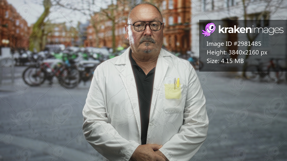 Man doctor in white coat with hands clasped, yellow pen in chest pocket, standing on urban street with bicycles and redbrick buildings; serious dignity. - Kraken Images