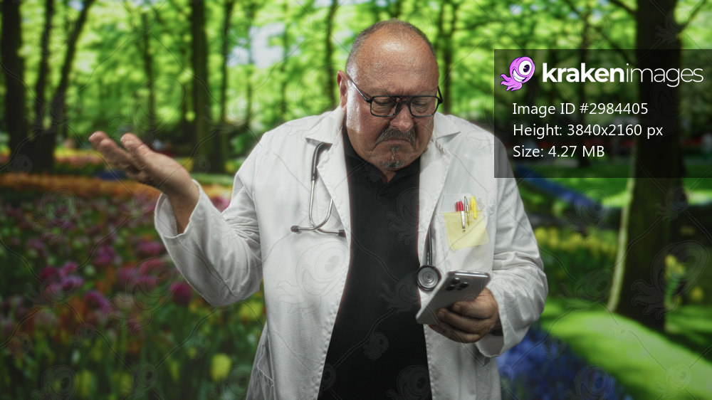 Man doctor in white coat holding smartphone, left hand palm up shrug gesture and frowning in forest; frustration.