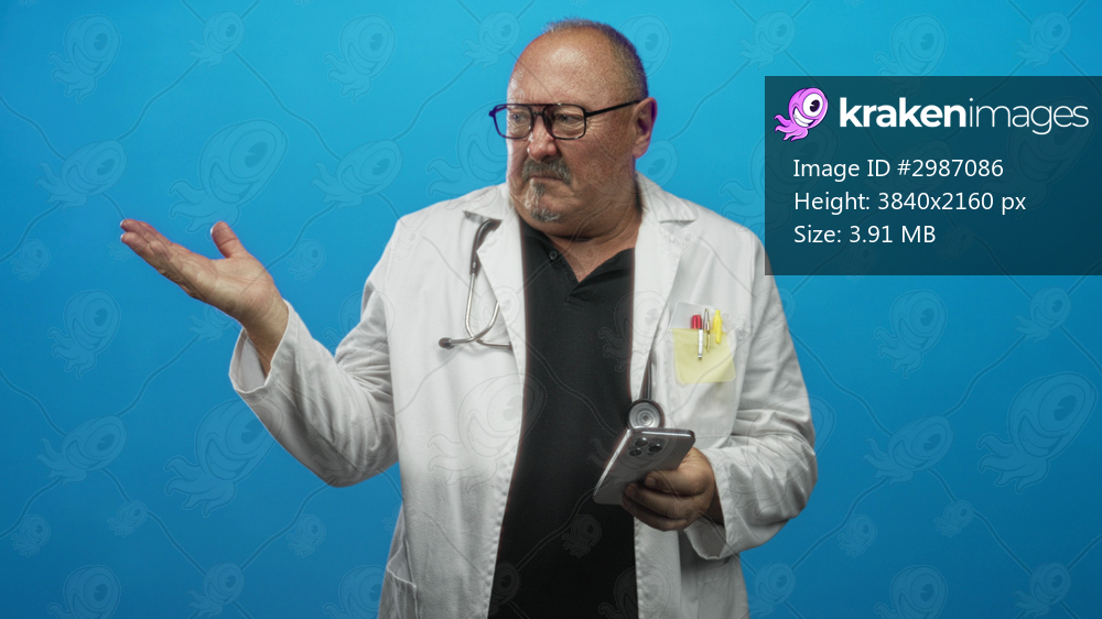 Man doctor in white coat holding smartphone with left hand raised in shrug gesture in studio; confusion concern technology.