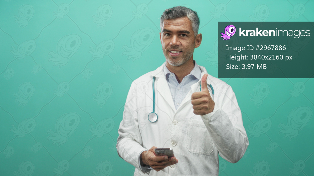 Man doctor in white coat holding smartphone and stethoscope showing thumb up gesture in studio; reassuring care trust.