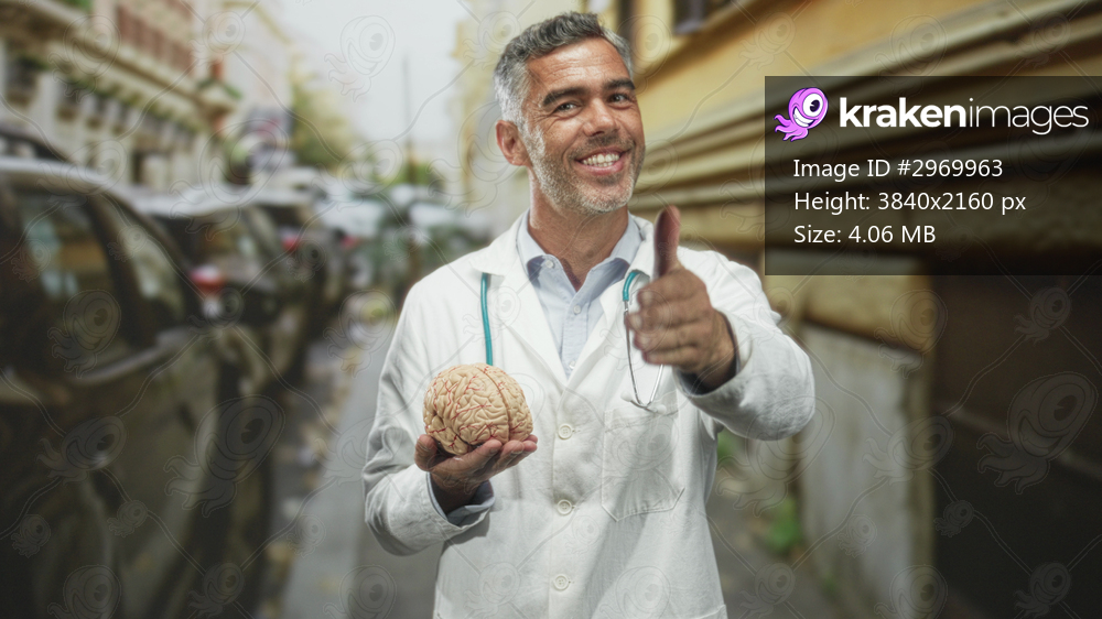 Man doctor in white coat holds a model brain in his palm on an urban street beside a building; medical education confidence.