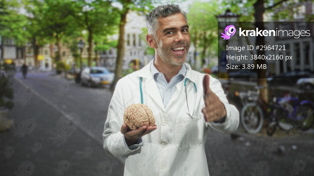 Man doctor in white coat holds a model brain in one hand and offers a handshake on a street; reassurance wellbeing.