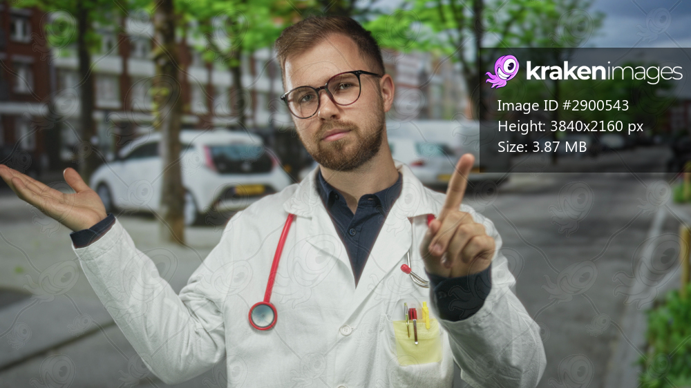 Man doctor in white coat points finger and holds palm up with stethoscope on a city street; medical advice confidence.