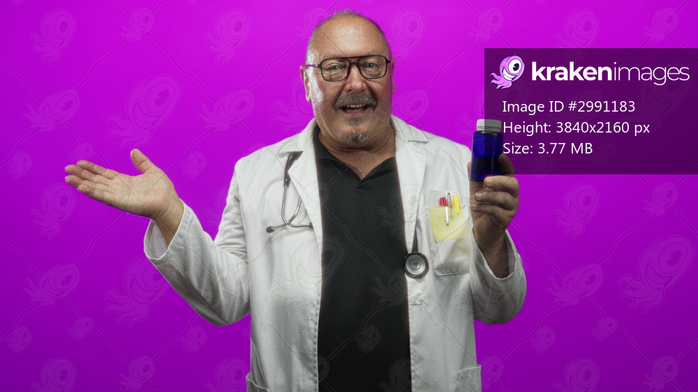 Man doctor in white coat points finger to pill bottle and opens palm in studio; health advice reassurance.