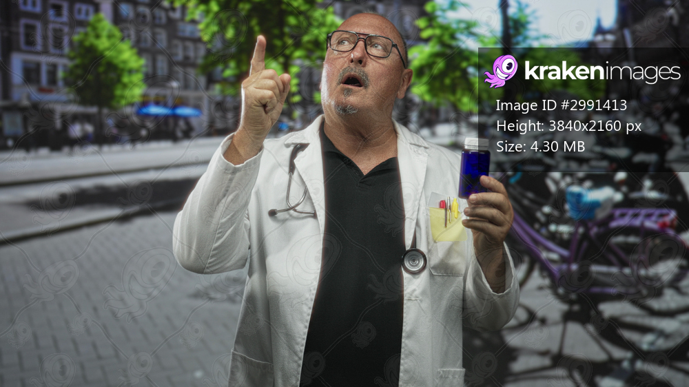 Man doctor in white coat points finger upward while holding a blue medicine bottle on street beside parked bikes; concern advice.