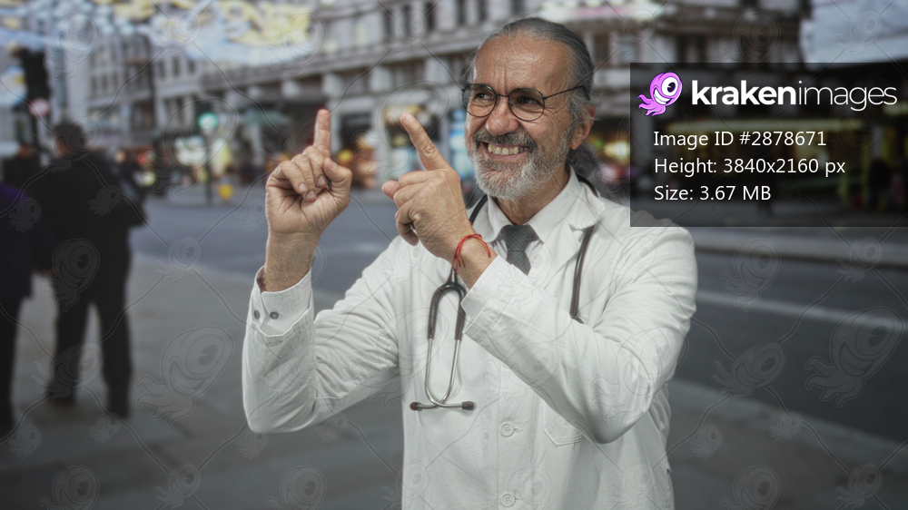 Man doctor in white coat points fingers with stethoscope on busy city street; community health optimism.