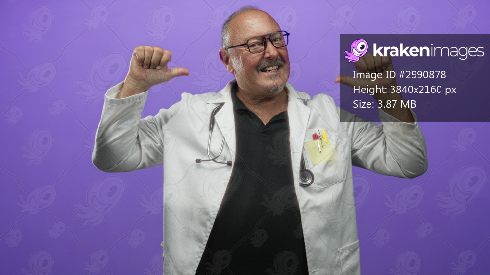 Man doctor in white coat points thumbs to chest with stethoscope and glasses in studio; confidence warmth.