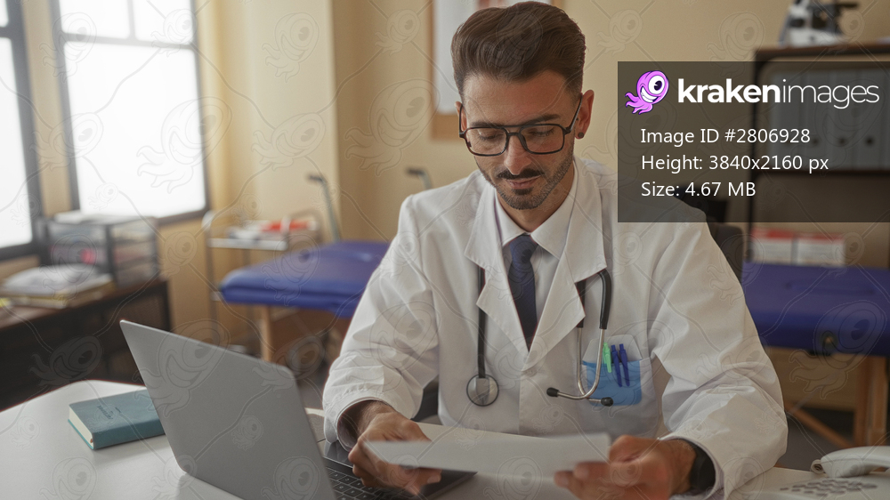 Man doctor in white coat reading paper with stethoscope around neck and smiling at desk in building; confidence.