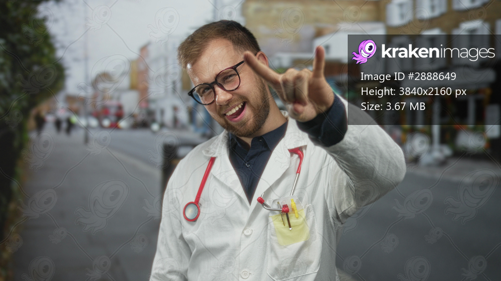 Man doctor in white coat with red stethoscope making rock horns and sticking tongue out on a city street; playful fun.
