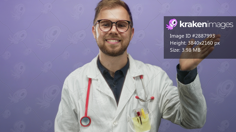 Man doctor in white coat with red stethoscope smiling and waving hand in studio with purple backdrop; friendly reassurance.