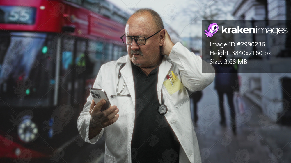 Man doctor in white coat with stethoscope checks smartphone while hand to neck on street with red doubledecker bus and sidewalk; concern fatigue.