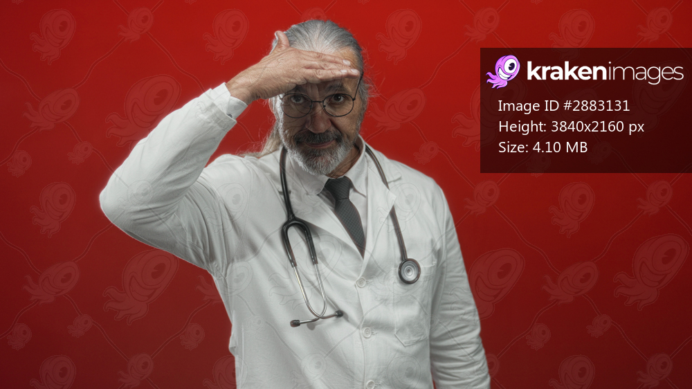 Man doctor in white coat with stethoscope covering his eyes with hand in studio red wall, hoary long hair and glasses visible; concern reflection.