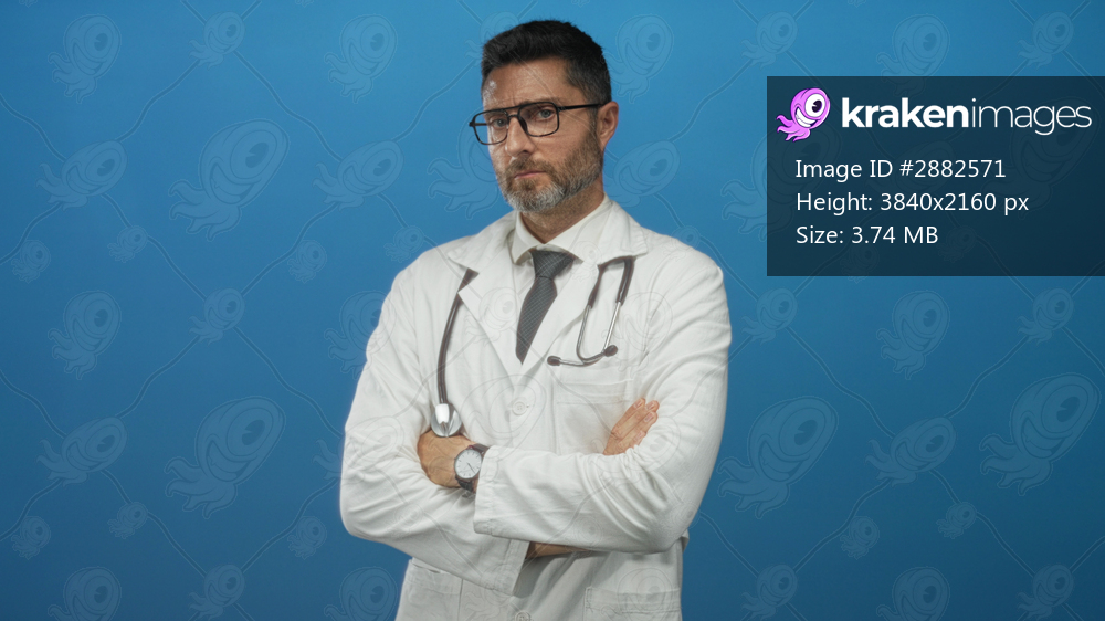 Man doctor in white coat with stethoscope and crossed arms in blue studio; professional confidence authority.
