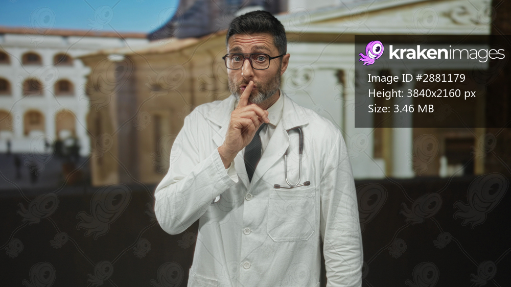 Man doctor in white coat with stethoscope, finger to lips gesture and pointing hand in building facade setting; calm reassurance.