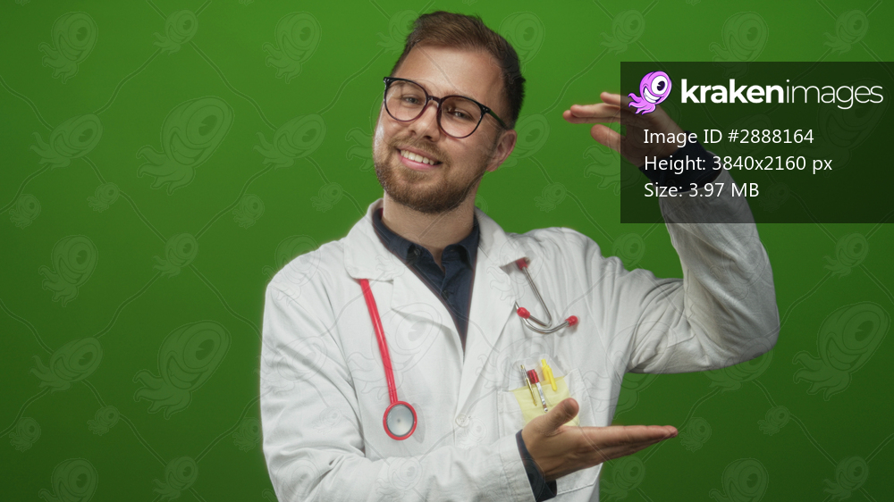 Man doctor in white coat with stethoscope and glasses framing an invisible object with hands in a green studio; healthcare trust reassurance.