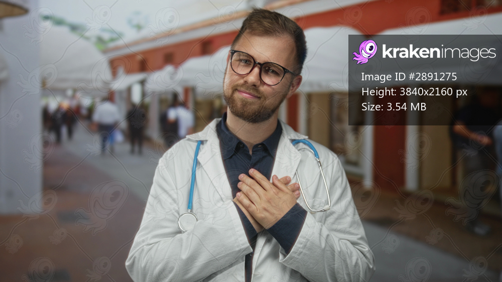 Man doctor in white coat with stethoscope and glasses holding hands over chest on busy street; compassion care healing.
