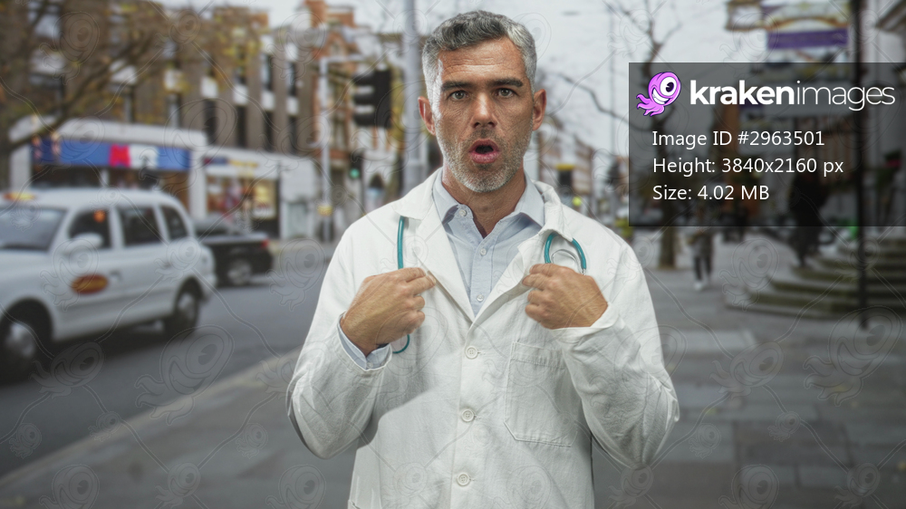 Man doctor in white coat with stethoscope grabs his lapel and then clenches fists, mouth open on a city street; relief.