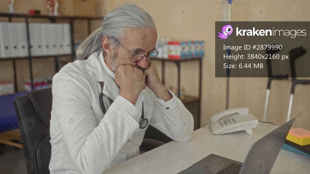 Man doctor in white coat with stethoscope, hand on chin using laptop at clinic building; quiet reflection concern.