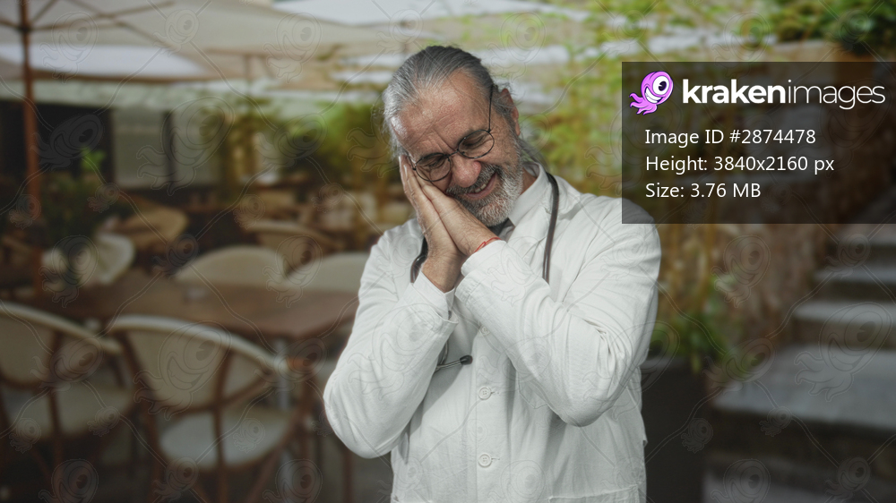 Man doctor in white coat with stethoscope hands clasped to cheek in building terrace outdoors; gentle compassion.