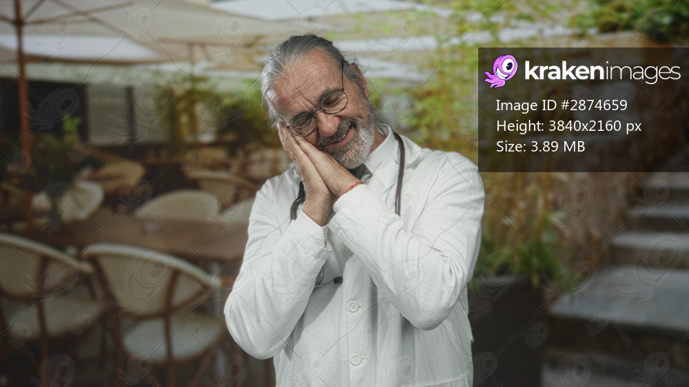 Man doctor in white coat with stethoscope hands clasped to cheek in building terrace outdoors; gentle compassion.