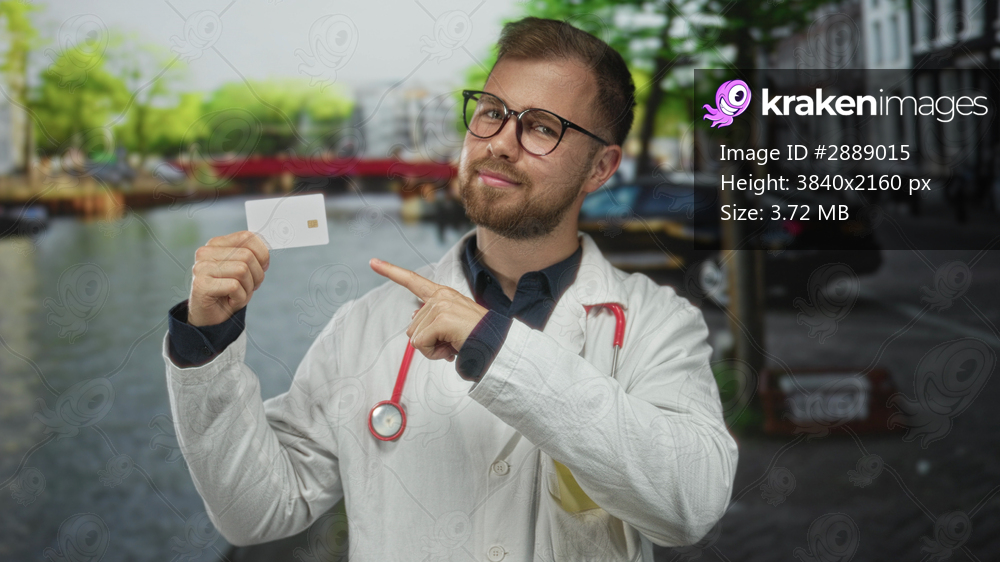 Man doctor in white coat with stethoscope holds card and points finger on an amsterdam street canal, wearing glasses and smiling; trust health confidence. - Kraken Images