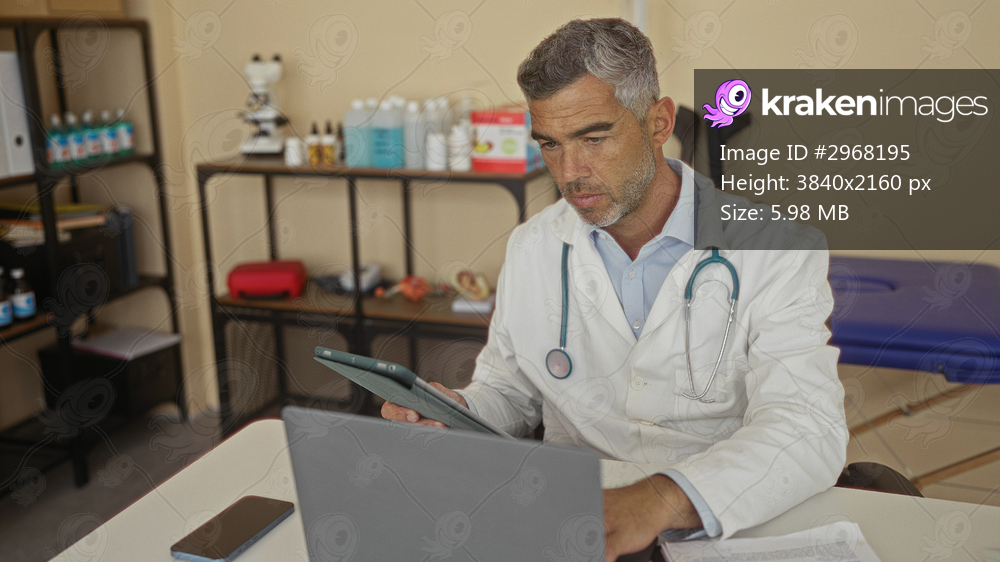 Man doctor in white coat with stethoscope holds tablet while typing on laptop at a desk in a medical building surrounded by supplies and exam table; quiet concentration. - Kraken Images