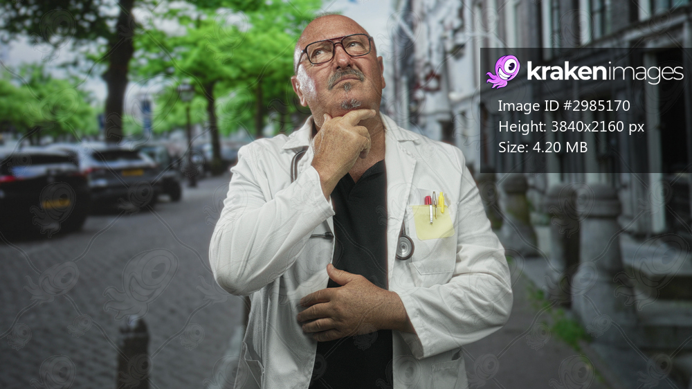 Man doctor in white coat with stethoscope and pens in pocket, hand on chin gesture on a cobblestone street by buildings and parked cars; thoughtful reflection. - Kraken Images
