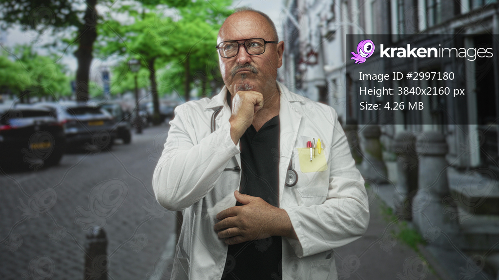 Man doctor in white coat with stethoscope and pens in pocket, hand on chin gesture on a cobblestone street by buildings and parked cars; thoughtful reflection. - Kraken Images
