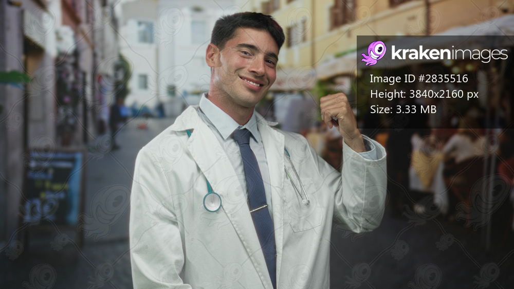 Man doctor in white coat with stethoscope pointing thumb backward on busy street; guidance confidence.