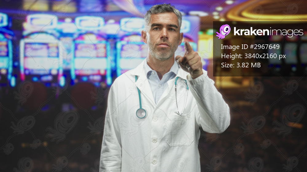 Man doctor in white coat with stethoscope points finger at camera in building with slot machines behind him; serious warning.