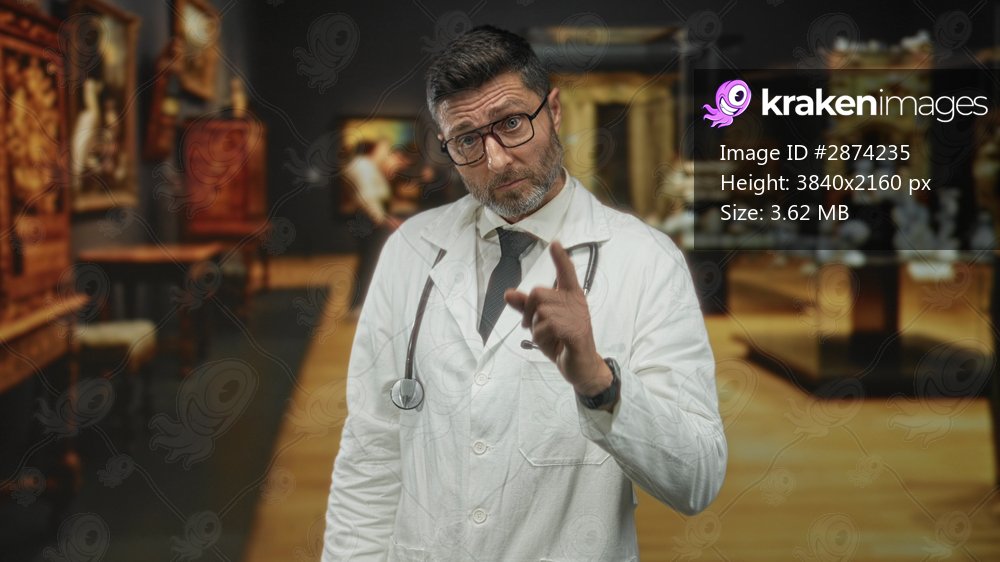Man doctor in white coat with stethoscope points finger in gallery building; warning responsibility trust.