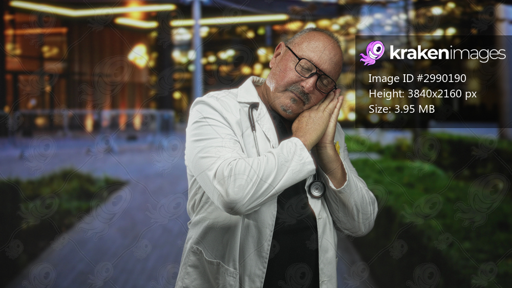 Man doctor in white coat with stethoscope presses hands to cheek for sleep outside building at night; quiet exhaustion.