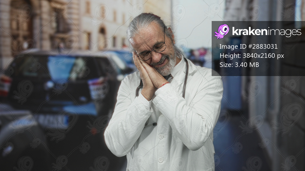 Man doctor in white coat with stethoscope presses hands to cheek on a city street, middle aged with grey long hair and glasses; quiet compassion.