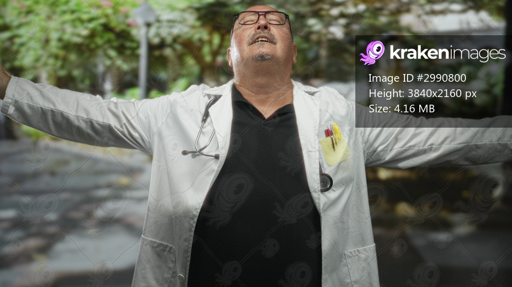 Man doctor in white coat with stethoscope raises arms wide and looks upward on street; relief hope resilience.