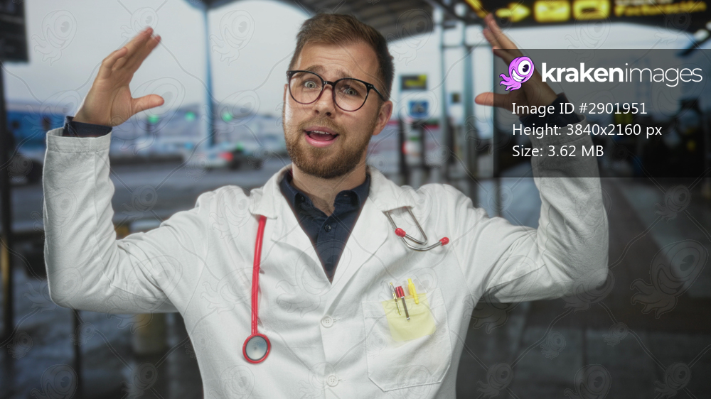 Man doctor in white coat with stethoscope raising hands at airport terminal near curbside; surprise approachability.