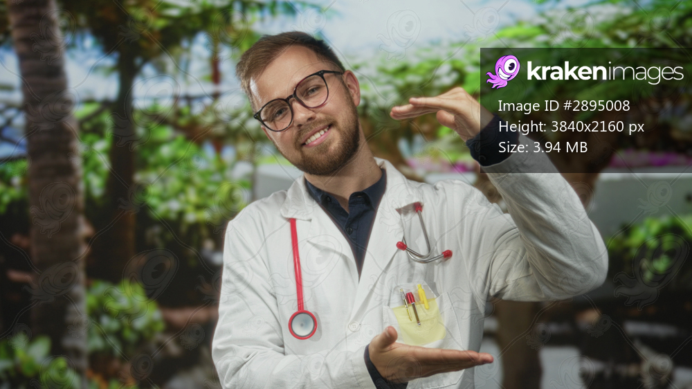 Man doctor in white coat with stethoscope, smiling and framing space between palms in forest; confidence trust wellness.