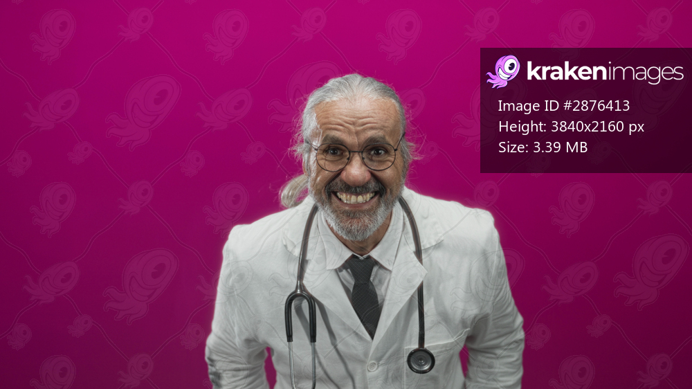 Man doctor in white coat with stethoscope smiling and leaning forward in studio with magenta backdrop; compassion trust.